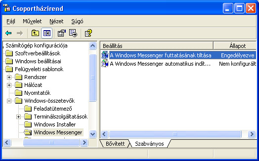 Helyben vagyunk, ha jól dolgoztunk, két elemet látunk a jobb oldalon, kettÅs kattintás az elsÅre (A Windows Messenger futtatásának tiltása), melyre egy ablak jön elÅ. Két dolgunk van mindössze: az ablak felsÅ sávján, az Engedélyezve szó elÅtti pöttybe tegyünk zöld pontot, és az OK gombbal zárjuk be az ablakot. Munkánkat siker koronázza, többé nem fog elindulni a WM. Se automatikusan, se kézzel.