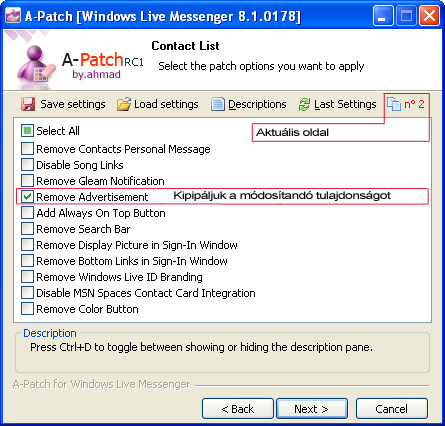 Az egyes oldalak között a „Next >” gombbal tudunk előre, a „< Back” feliratúval pedig hátra lépkedni. A 8., azaz az utolsó oldalon már csak az „Apply”, azaz az Elfogad gombra kell klikkelni, majd a figyelmeztető szövegen megnyomni az Ok gombot. Ekkor elkezdődik a módosítás, majd újraindul az MSN Messenger. Ezután már a kért módosításokkal élvezhetjük a csevegéseket.